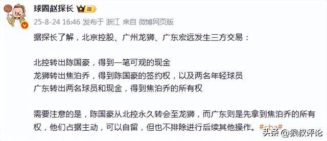 广东转出两名球员和现金,得到焦泊乔的所有权。