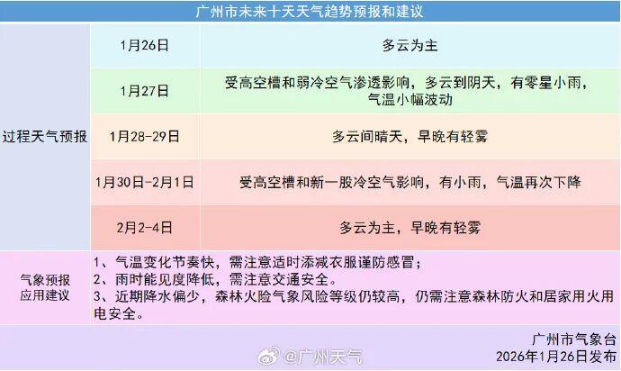 广州市气象台预计,1月27日弱冷空气渗透,广州多云间阴天,局部有零星小雨,气温小幅下降。1月28日—29日,广州多云间晴。