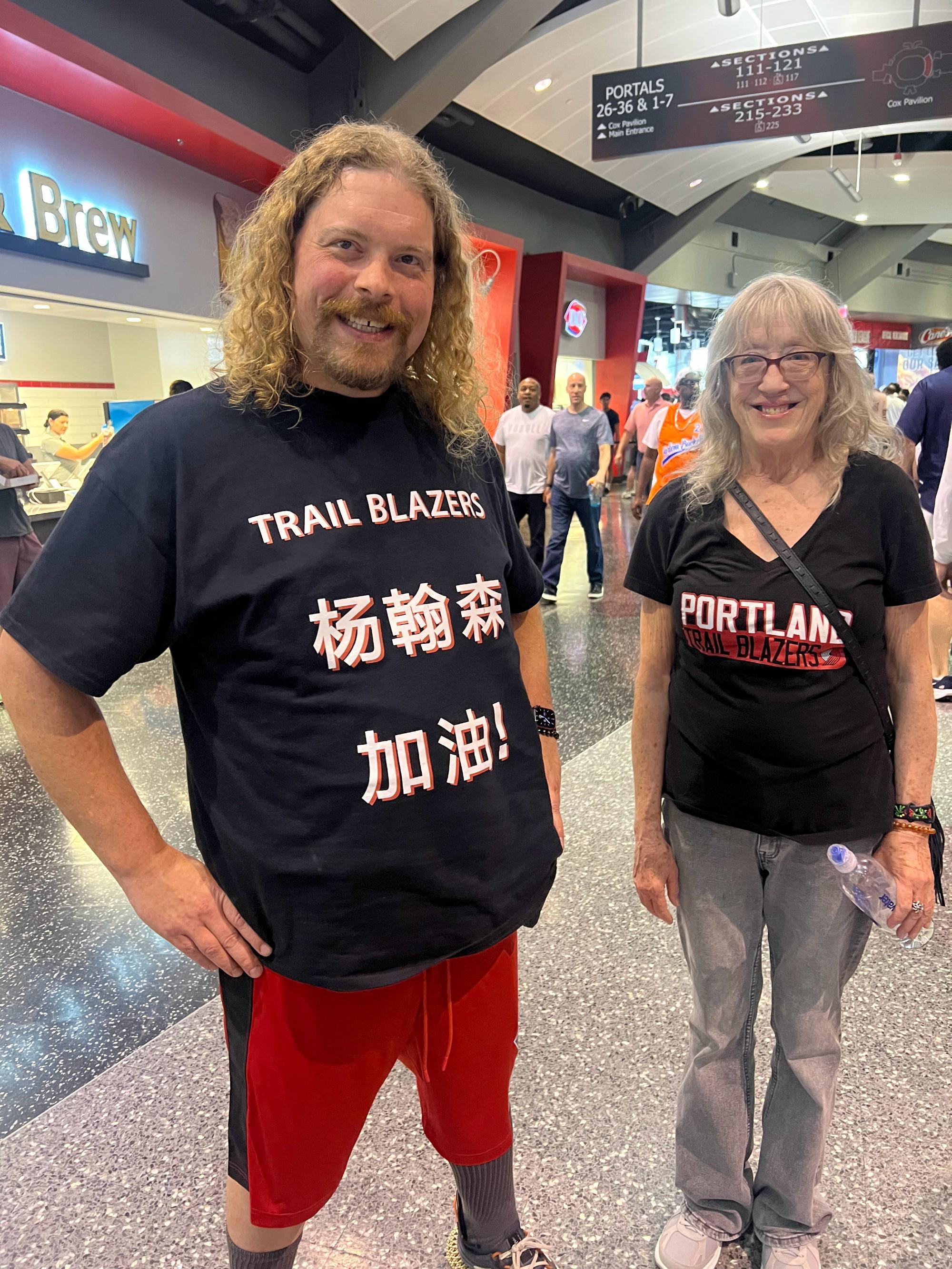 殳海表示:“一位大哥穿着一件神奇的T从我面前飘过,赶紧追了过去跟他说我要把你衣服给中国球迷拍下来。大哥说就是有其他中国球迷帮忙给他做的衣服,但好像少了个三点水哈哈哈。另外大哥还说开拓者球迷非常喜爱瀚森,他最欣赏的就是小杨的传球能力了。”